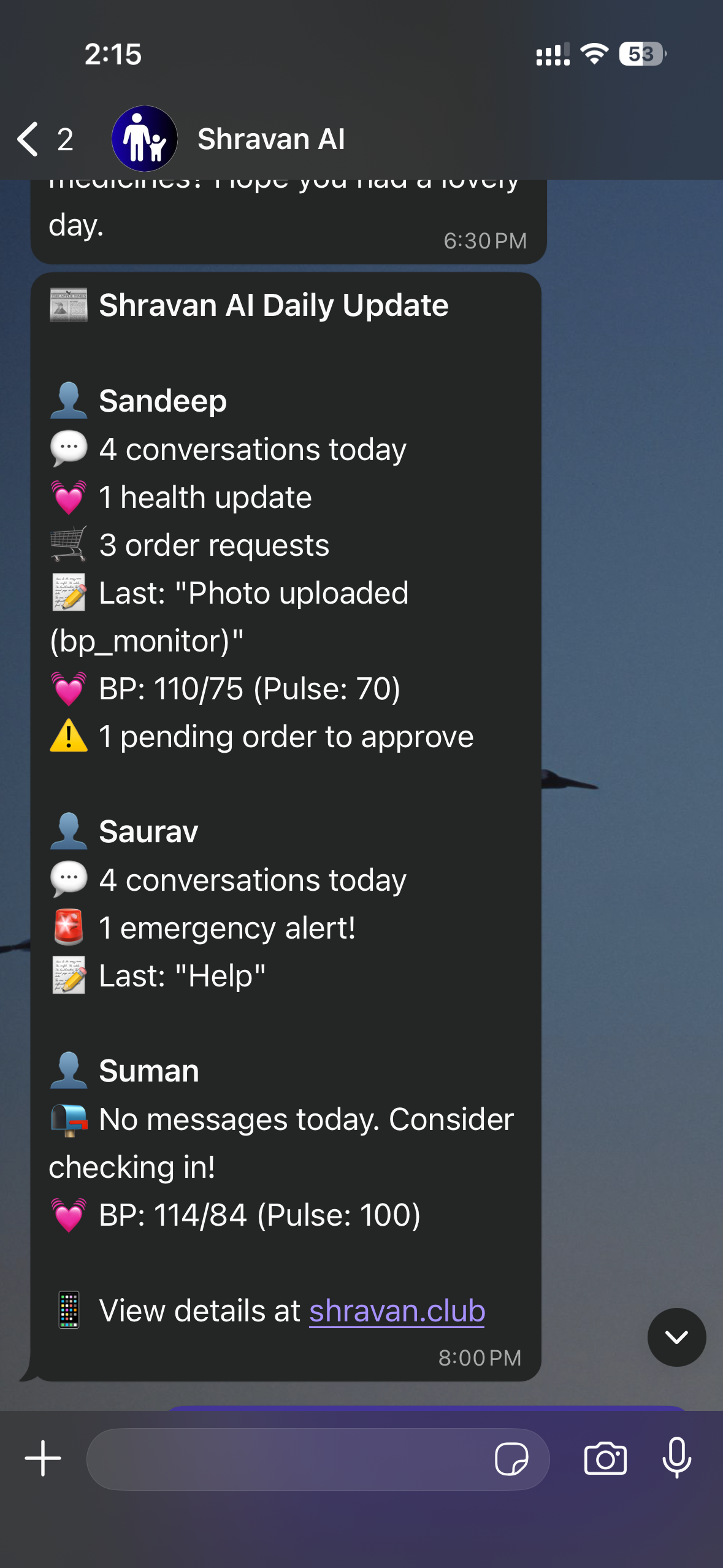 I live in California, my parents are in Mumbai. Shravan AI gives me the daily summary of how they're doing, what they ate, their BP and medicines. It's like being there with them.